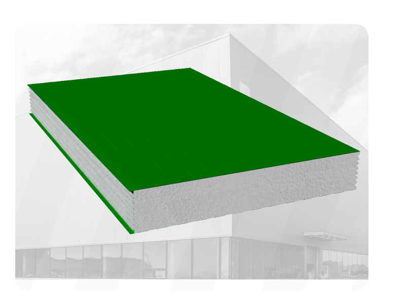 - Es un panel sándwich compuesto por 2 laminas metálicas externas y un núcleo aislante de Poliestireno expandido (EPS). El panel presenta la suficiente rigidez estructural gracias a sus 3 crestas en cara externa y las nervaduras presente en los valles de la misma. Las crestas están rellenas de trapecios de Poliestireno expandido para mantener la continuidad del núcleo